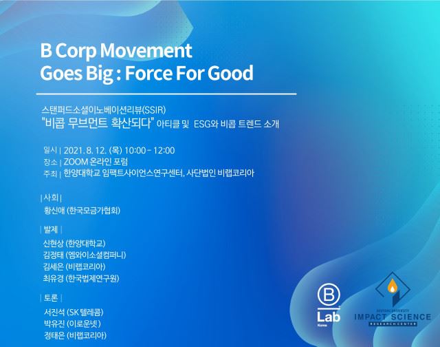 [강소기업뉴스 최미래 기자] 비랩코리아(B Lab Korea, 대표 정은성 이사장)는 8월 12일(목) 오전 10~12시에 한양대 임팩트사이언스 연구센터(센터장 신현상 교수)와 공동으로 스탠퍼드 소셜 이노베이션 리뷰(SSIR)에 발간된 ‘비콥(B Corp) 무브먼트 확산되다’ 아티클을 중심으로 온라인 포럼을 개최한다.
