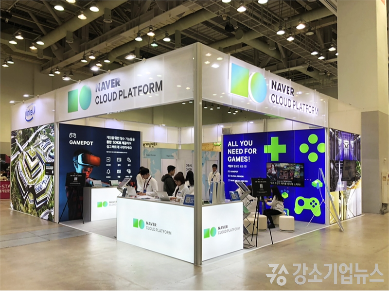 국내 최대 게임쇼 ‘지스타(G-STAR)’에 참가한 네이버클라우드 전시관. 10년 전부터 꾸준히 연구하고 도입해온 친환경 모듈인 패브릭 부스를 적용했다. [사진=아이엔디자인그룹]