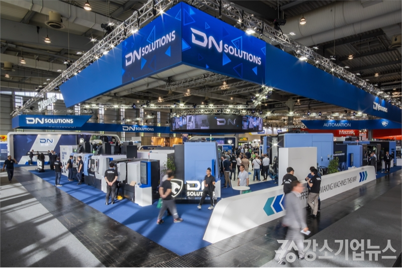 아이엔디자인그룹의 패브릭 부스를 적용한 또 다른 사례로, 독일 하노버에서 열린 세계 최대 공작기계 전시회 ‘EMO’에 DN솔루션즈가 참가했다. [사진=아이엔디자인그룹]