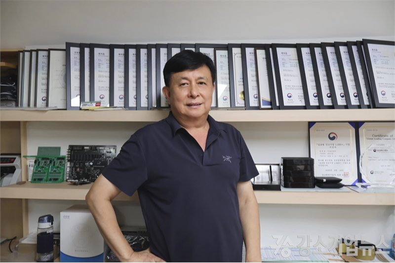 캡쳐 윤영복 대표가 특허증 앞에서 포즈를 취하고 있다. 캡쳐는 현재 40여 개의 특허를 보유하고 있으며, 이를 기반으로 ‘홍채인식용 카메라 모듈’과 ‘배터리 재활용 기술’ 개발에 주력하고 있다. [사진=강소기업뉴스]
